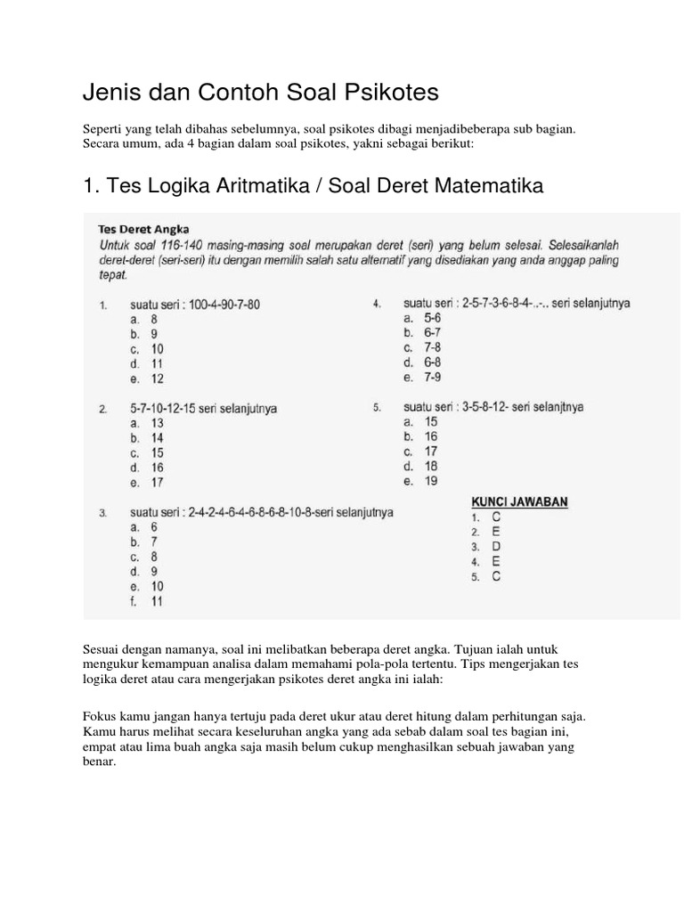Contoh soal psikotes aritmatika salah satu tes yang sering digunakan dalam setiap penerimaan karyawan baru adalah tes aritmatika. Tes ini digunakan untuk mengukur memperkirakan serta menilai kepandaian seseorang terutama kepandaian penalaran berhitung dan berfikir logis. Contoh soal psikotes.