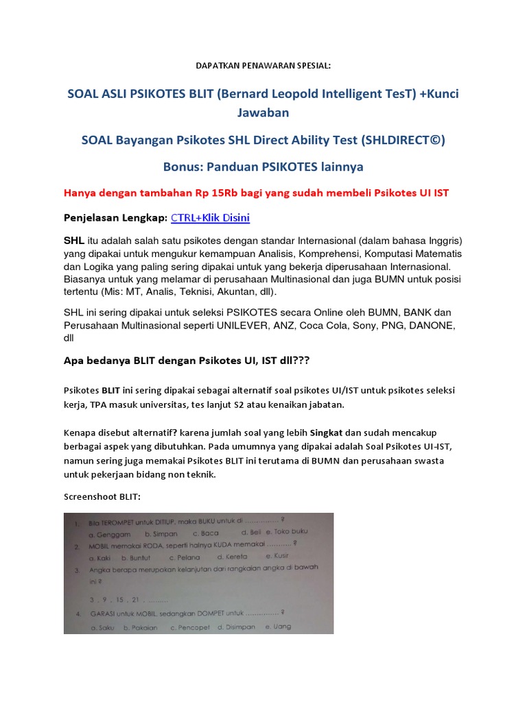 Jual Soal Psikotes Blit Kunci Jawaban Bonus Psikotes Shl