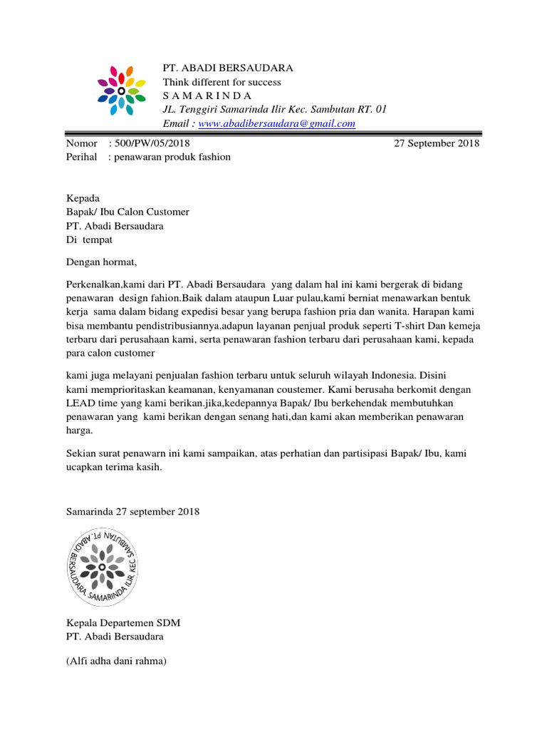 Contoh surat penawaran barang ke perusahaan. Dalam dunia bisnis, penawaran akan selalu ada antara pihak satu dengan pihak lainnya. Apakah kamu sedang mencari contoh surat penawaran barang dan jasa? Surat penawaran termasuk salah satu contoh surat resmi. Apa itu surat penawaran barang? Sesuai namanya, surat penawaran kerjasama merupakan surat yang digunakan oleh suatu perusahaan untuk menawarkan kerjasama berupa barang maupun jasa dengan perusahaan lainnya. Sebuah surat penawaran barang dibuat dalam bentuk surat formal yang di dalamnya tertera tidak ada salahnya kita melihat beberapa contoh surat penawaran yang pernah dikeluarkan oleh perusahaan lain sebagai referensi. Surat penawaran ini diharapkan menjadi awal mula atau pembuka kerjasama antara pihak perusahaan dengan klien atau perusahaan lain. Surat penawaran ini biasanya dipakai tidak hanya untuk aktifitas bisnis saja, tapi biasa dipakai oleh perusahaan untuk menjalin kerja sama dengan perusahaan berikut ini contoh surat penawaran kerjasama dari salah satu cv di nganjuk Pt jati mahoni jalan demak jepara 121, jepara. Contoh surat penawaran harga barang/produk berikut ini juga ada yang menamakan sebagai surat perkenalan perusahaan. Di pertemuan ini kembali lagi gambaran perusahaan yang ada. Rekam proyek serta pekerjaan yang ditangani.