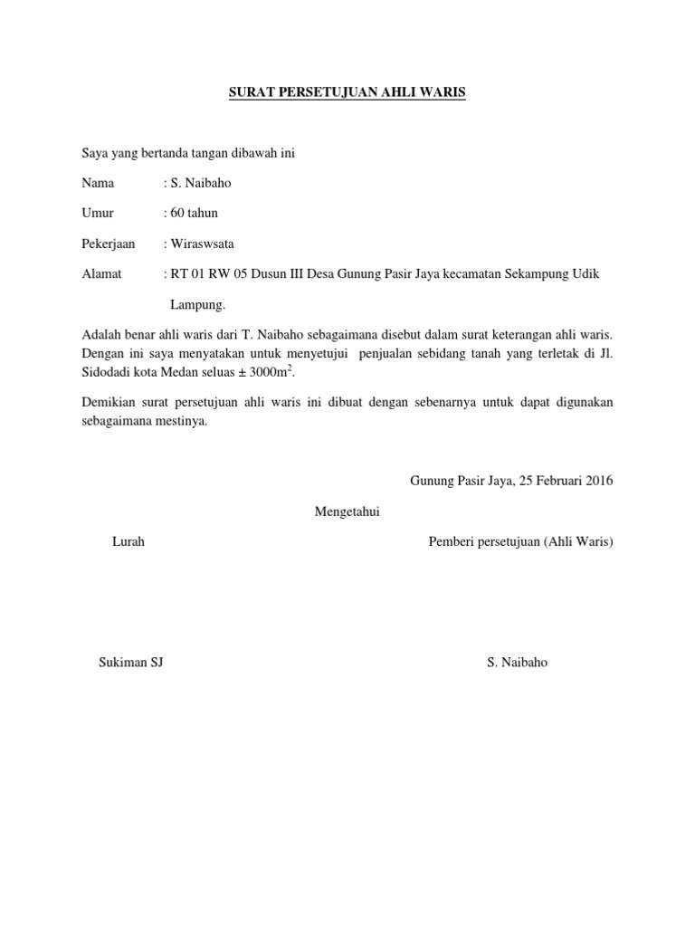 Surat kuasa ahli waris tidak boleh menghambat proses transaksi. Surat perjanjian kesepakatan ini disepakati oleh seluruh ahli waris disaksikan oleh wali. Surat persetujuan ahli waris untuk jual beli warisan. Misalnya untuk jual beli tanah waris ini walaupun tanah adalah hak waris maka tetap akan dibuatkan prosedur suratnya. Contoh surat ahli waris dari kelurahan.