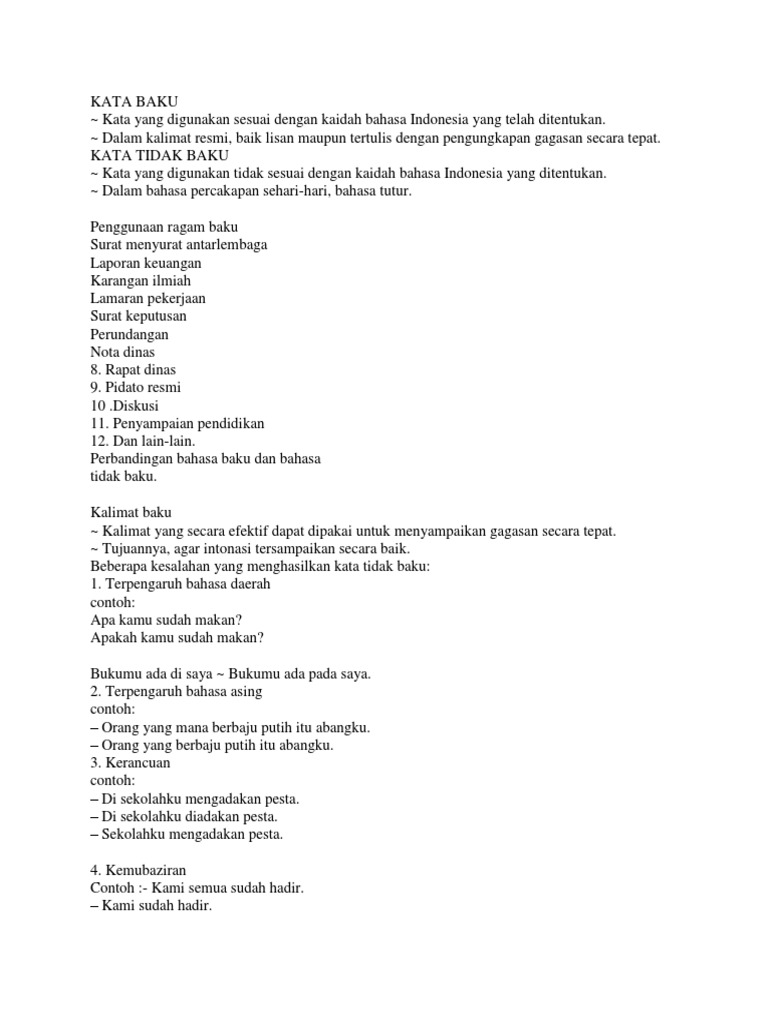 Kata Baku Tidak Baku from imgv2-1-f.scribdassets.com Kalimat yang secara efektif dapat dipakai untuk menyampaikan gagasan secara tepat dengan tujuan agar intonasi tersampaikan secara. Karena faktor kebiasaan dan tidak pernah diperbaiki, maka kata tidak baku. Kalimat baku dan tidak baku. Gunakan yang sesuai dengan konteks kalimat. Contoh kalimat menggunakan kata tidak baku. Ciri ciri kata tidak baku. Terdapat lebih dari 1000 kata baku yang sering dipakai, entah itu untuk istilah keseharian ataupun ilmiah. Perlu diketahui bahwa karena sifat bahasa yang dinamis, kbbi setiap beberapa tahun sekali diperbarui, dan kini kbbi telah sampai pada jilid v.